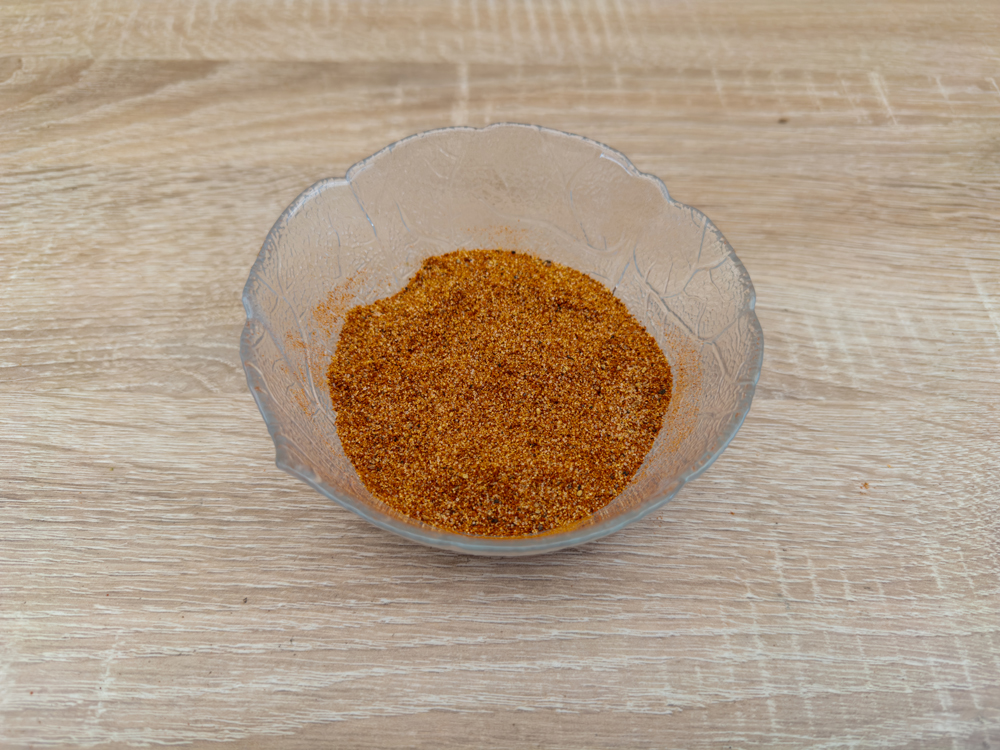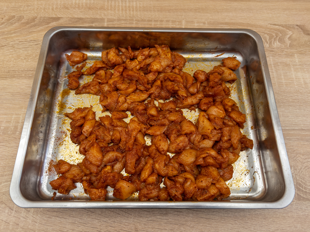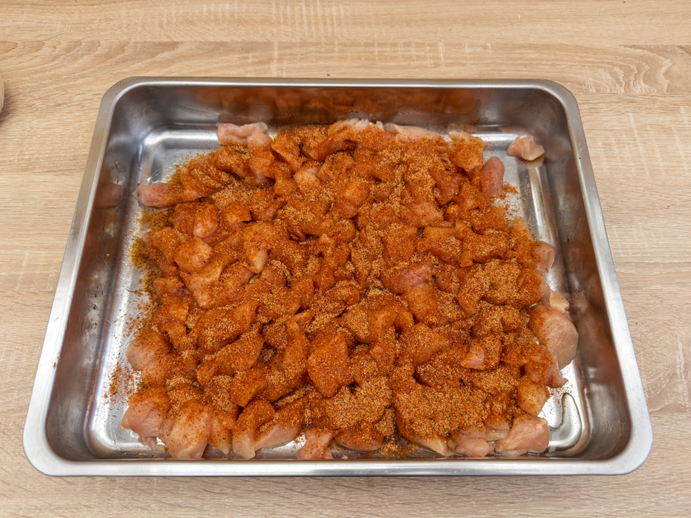 - Das Gewürz/Rub über die eingeölten Hähnchenbruststreifen verteilen, und einmassieren.
