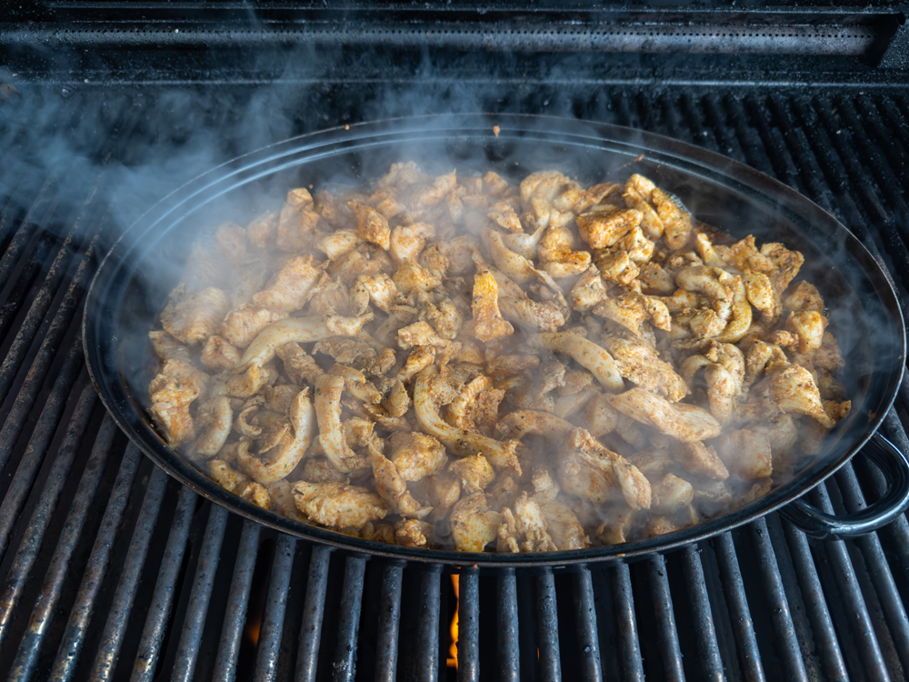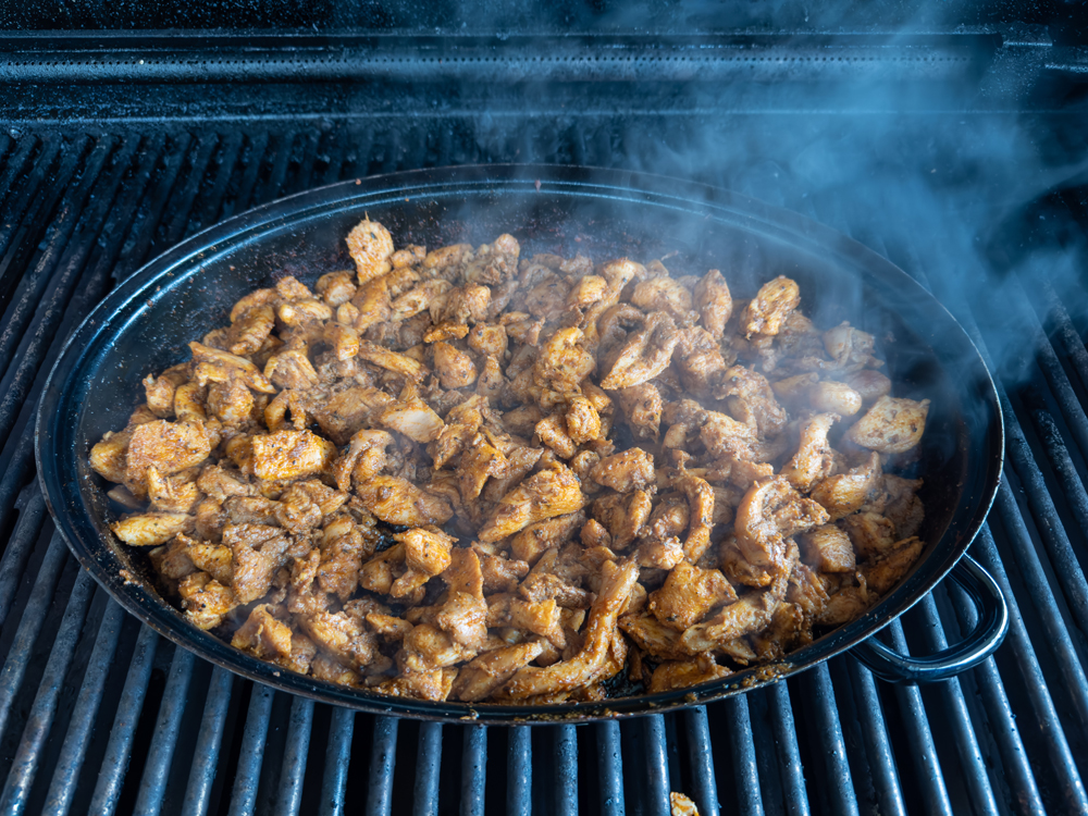 - Nach dem die Hähnchenbruststreifen 4-6 Stunden im Kühlschrank gezogen haben, werden sie vom Behälter ausgepackt, und auf dem Grill in der direkten Zone angegrillt. Es kann dazu eine Pfanne, oder Plancha benutzt werden.
