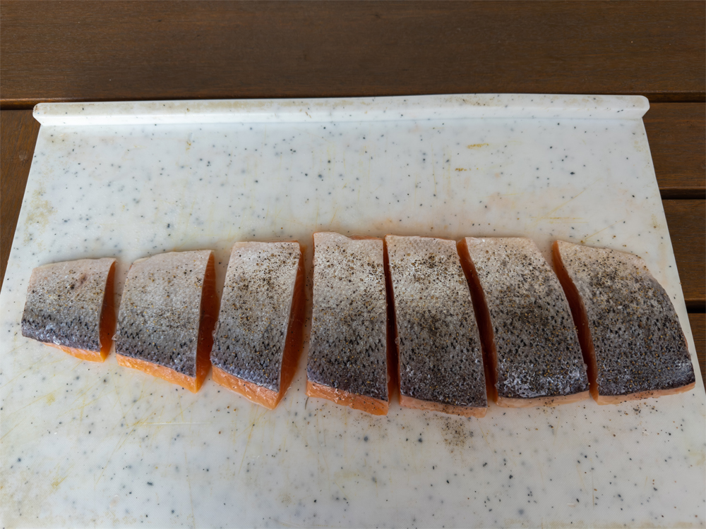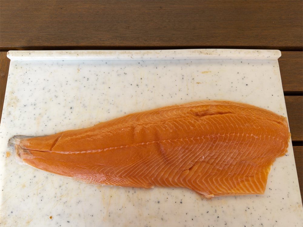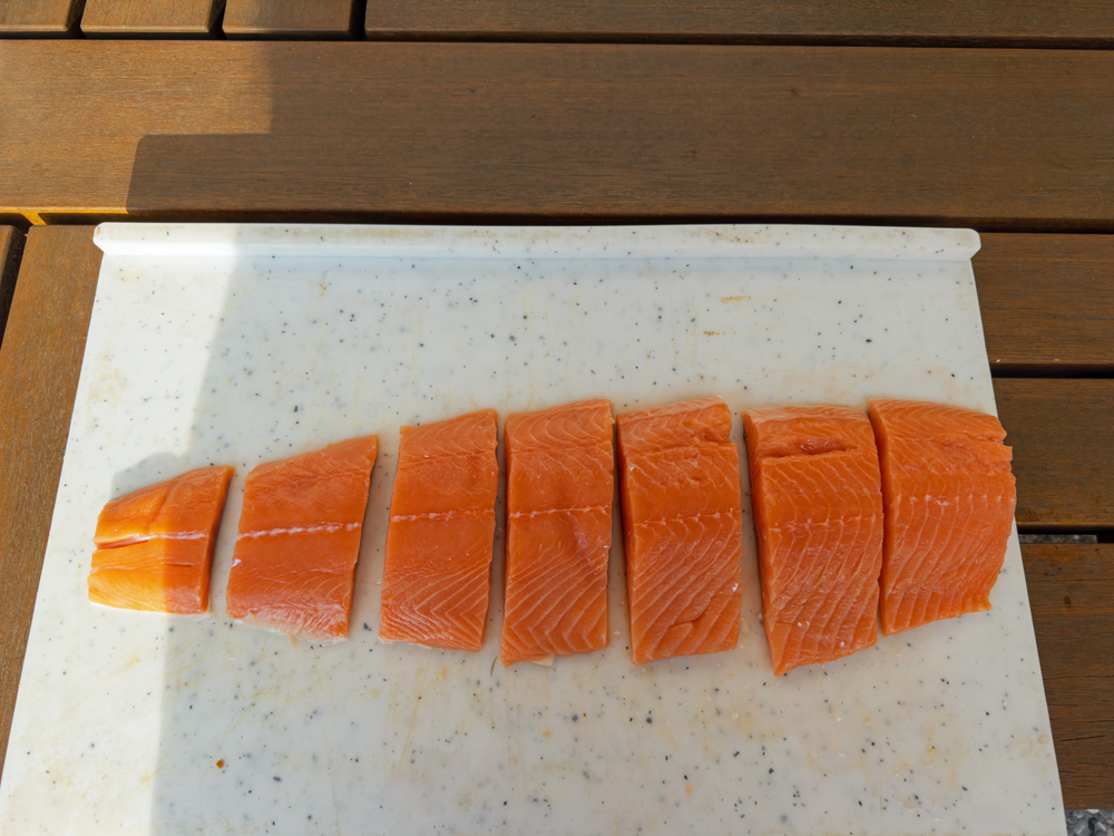 Hier zeige ich Euch meine Schrittanleitung für die Zubereitung einer Lachsseite in Stücke.