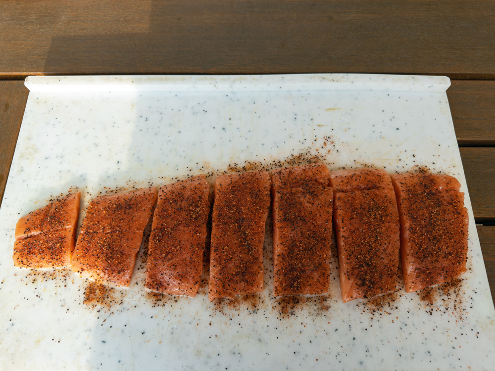 Lachsstreifen von der Vorderseite, und von der Hinterseite mit eurem Gewürz würzen.
